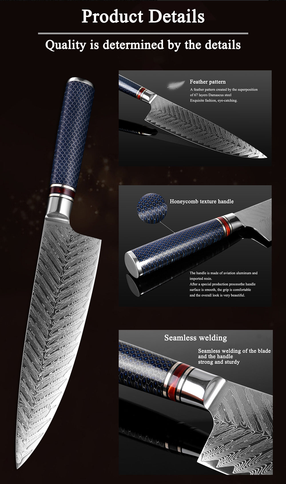 SUPER SHARP EDGE - 67-layer Japanese Damascus super steel with a finely polished surface. Corrosion-resistant and tough. The hand-bent edge is sharp, more durable and sharper. It can be stabilized at 60±2HRC with vacuum heat treatment hardness and durable sharpness.